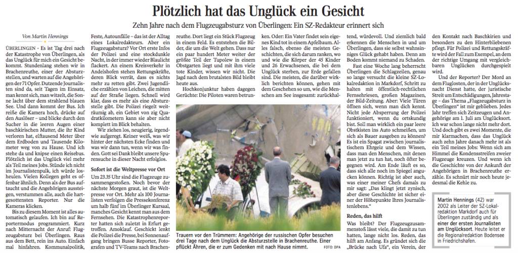До этого момента все происходило как бы автоматически. Я запрограммирован в режиме репортера. Около полуночи я слышу телефонный звонок. Авиакатастрофа рядом с Юберлингеном. Я выскакиваю из кровати и бегу к машине. Нужно ехать туда. Коммунальная политика, праздники, аварии на дорогах - все это постоянно присутствует в рабочих буднях журналиста региональной газеты. Но как писать об авиакатастрофе? На месте я опрашиваю полицейских. Темную ночь пронизывает синий свет полицейских мигалок. На одном из перекрестков в Андельсхофене стоят спасатели, в глазах которых видно отчаяние. Спасать здесь уже некого. Два мальчика рассказывают мне, что они видели трупы, лежащие прямо на дороге. Становится понятно: где-то здесь лежат обломки.