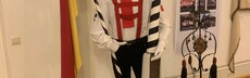 Im Hintergrund sind alle Masken der Bräutelzunft Scheer.