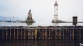 Aus Schalwänden, Sandsäcken und Betonsteinen errichten sie eine 1,30 Meter hohe Schutzwand rund um die Hafenpromenade.
