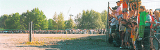 Mein frühes Timing zahlte sich aus. Ich ergatterte einen prima Platz in der „ersten Reihe", nämlich direkt am Zaun, der rund um das Messegelände gezogen wurde. Immer mehr Menschen kamen hinzu und füllten so das Gelände.