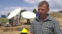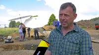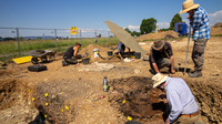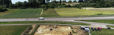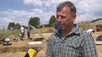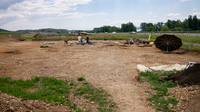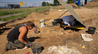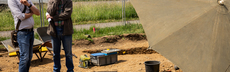Sie markieren mit Sprühfarbe und Zetteln Fundstellen und Erdschichten.