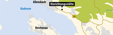 Am unteren Rand der Karte ist der Untersee zwischen der B33 und der Insel Reichenau eingezeichnet, von wo die Verurteilten über den See zur Hinrichtung gebracht wurden.