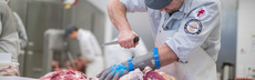 während er mit geschickten Bewegungen Fleisch auslöst. Der Fleischermeister