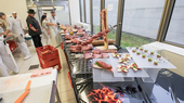 Landesinnungsmeister, führt voller Stolz durch die Reihen der mit Fleisch