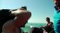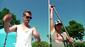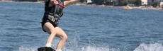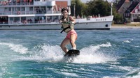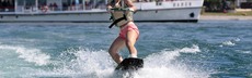 Redakteur Michael Scheyer testet das Hoverboard, das mit Rückstoß vom Jetski aus angetrieben wird.