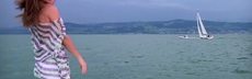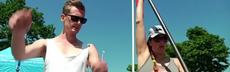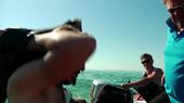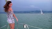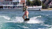Playmate Verena Stangl testet Wassersportgeräte für die Werbefotos der Interboot-Messe.