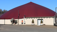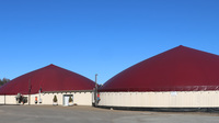 Bei 40 Grad Temperatur vergärt die Biomasse langsam. Unter den großen roten Folien blubbert eine dicke braune Masse, ständig von einer Maschine durchgerührt. Mithilfe von Bakterien, die sich im Inneren des Fermenters befinden, entsteht in mehreren Abbaustufen das Biogas.
