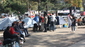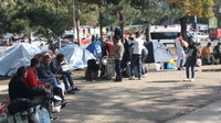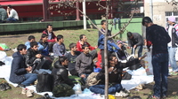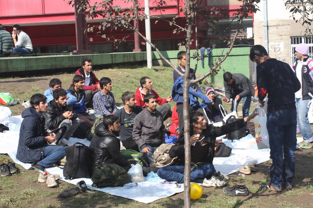 Männer aus Pakistan, Afghanistan, Irak und Syrien ruhen ihre wundgelaufenen Füße auf den Bänken vor dem roten Gebäude der Wirtschaftsfakultät aus. Dazwischen sind auch viele Frauen mit Kopftüchern, mit Kindern auf dem Arm.