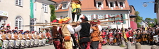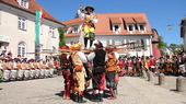 Dazu gehört traditionell auch Artistik mit der "Nürnberger Rose" (siehe Foto). Dabei dirigiert die Tambourmajorin des Landknechtszugs Ellerbach-Freyberg das Standkonzert aller teilnehmenden Fanfarenzüge aus luftiger Höhe.