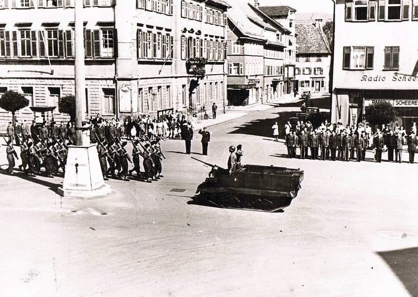 So schildert der ehemalige Stadtarchivar Peter Eitel den 28. April 1945, einen Samstag, als die Franzosen in Ravensburg einmarschieren. „Um die Mittagszeit rief der Kommandant der französischen Truppen von Baienfurt aus das Rathaus in Ravensburg an und teilte mit, dass die Besetzung der Stadt unmittelbar bevorstehe“, erinnert sich ein Zeitzeuge laut Archivar Eitel. „Zugleich warnte er in scharfen Worten vor Widerstand gegen die einmarschierenden Truppen.“
