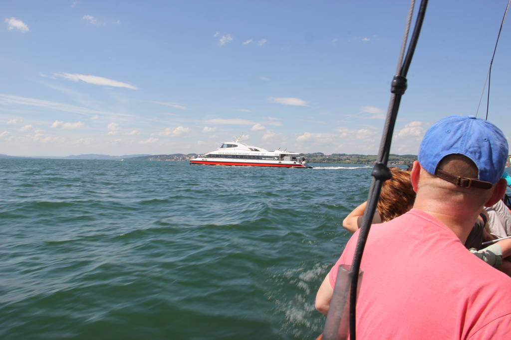 Auf der Bugseite lehnt sich Hans Weißinger nach vorne in Richtung der Kühlbox, die auf dem Schiffsparkett lagert, greift nach den eiskalten Flaschen. „Wer will was trinken?“, fragt er die Ausflugsgäste. „Wir haben Apfelschorle, Wasser, Bier und natürlich Hagnauer Wein.“ Auf Zustimmung muss Weißinger nicht lange warten. „Früher haben sie auf dem Schiff gesoffen wie die Bürstenbinder“, raunzt der Schwabe. Der Kutter treibt mitten im See, immer weiter Richtung Altnau, einem kleinen Dorf auf der Schweizer Seeseite. Das Motto an Bord: bloß keine Eile.