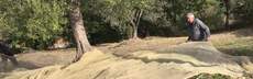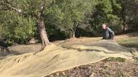 Familien kommen zusammen, Helfer unterstützen die Ernteteams. Dann werden zuerst große Netze unter den Bäumen ausgebreitet.