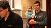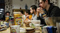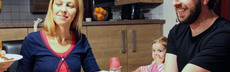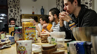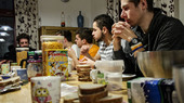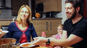 Abendessen mit den Gasteltern Sara und Felix Bader und ihrer elf Monate alten Tochter. Die Gasteltern wohnen Tür an Tür mit den Häftlingen, essen mit ihnen, korrigieren Schularbeiten und sind Ansprechpartner bei Problemen. Unterstützung bekommen sie von zwei FSJlern.