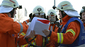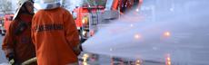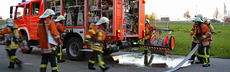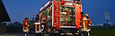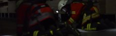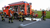 Sie rollen die Wasserschläuche ab, stecken sie zusammen und verbinden sie mit den Hydranten, fahren die Flutlichter ausund versuchen die Ausbreitung des Feuers zu verhindern und den Brand zu löschen.